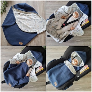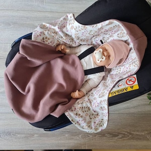 The three-point seat belts of the baby seat can be easily guided through the sewn-in belt holes. This means your baby can be buckled and unbuckled perfectly. If it does get too warm in the car, the blanket can simply be opened and the little sparrow still stays strapped in.