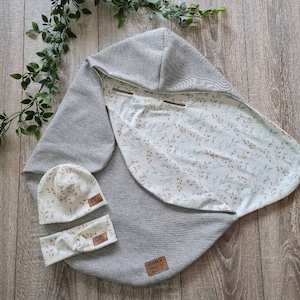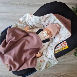 The seat belts of the baby seat can be easily guided through the sewn-in belt holes. This means your baby can be buckled and unbuckled perfectly. If it does get too warm in the car, the blanket can simply be opened and the little sparrow still stays strapped in.